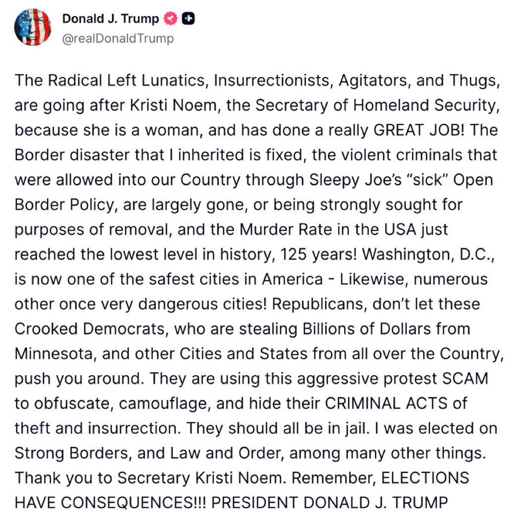 Леворадикальные сумасшедшие, повстанцы, агитаторы и головорезы нападают на Кристи Ноэм, министра внутренней безопасности, потому что она женщина и проделала действительно замечательную работу!Пограничная катастрофа, которую я унаследовал, устранена, жестокие преступники, которым был разрешен въезд в нашу страну из-за политики открытых границ Сонного Джо, в основном исчезли или находятся в усиленном розыске с целью выдворения, а уровень убийств в США только что достиг самого низкого уровня за всю историю за 125 лет!