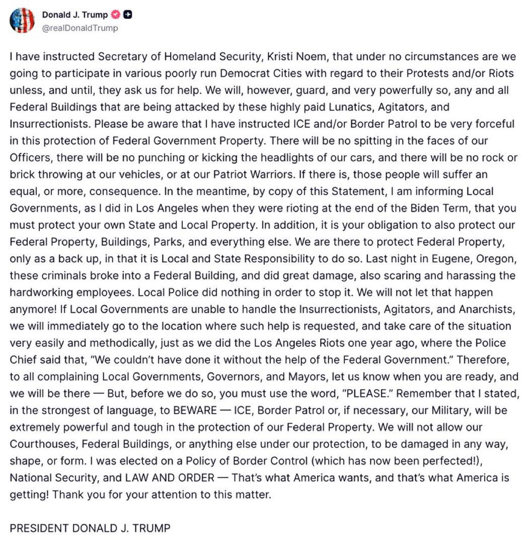 Я дал указание министру внутренней безопасности Кристи Ноэм, что ни при каких обстоятельствах мы не будем принимать участие в операциях в различных плохо управляемых демократических городах в связи с их протестами или беспорядками, если и до тех пор, пока они не обратятся к нам за помощью.Однако мы будем охранять, и очень эффективно, все федеральные здания, подвергающиеся нападениям этих высокооплачиваемых безумцев, подстрекателей и мятежников. Пожалуйста, имейте в виду, что я поручил ICE и пограничной службе действовать очень решительно при защите федеральной государственной собственности. Не будет плевков в лицо нашим сотрудникам, не будет ударов кулаками или ногами по фарам наших автомобилей и не будет бросания камней или кирпичей в наши транспортные средства или в наших патриотических воинов.