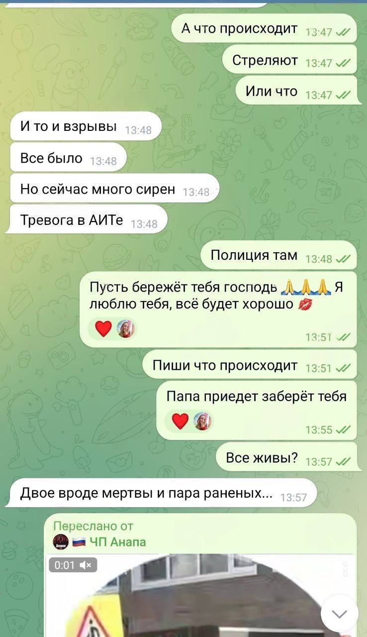 Сегодня Россию всколыхнула ещё одна трагедия. На этот раз в анапском техникуме. Это уже шестой теракт за учебный месяц. На скриншотах — те самые сообщения, которые местные ученики, забаррикадировавшиеся в кабинетах от стрелка, в страхе и отчаянии писали своим родным. Прощальные эсэмэски для мамы и родных. Дети боялись, что могут не пережить этот день. Страшно.