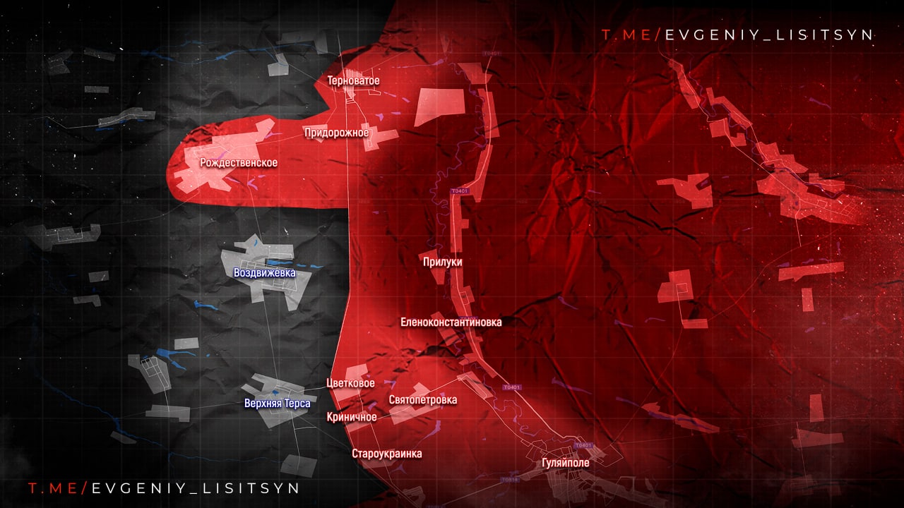 Продвижение от Зализничного к Гуляйпольскому и Горькому. Возвращён контроль над Придорожным, освобождено Рождественское. Угрозы перерезания трассы Орехов–Новониколаевка. У Терноватого - атаки ВСУ, фронт нестабилен.