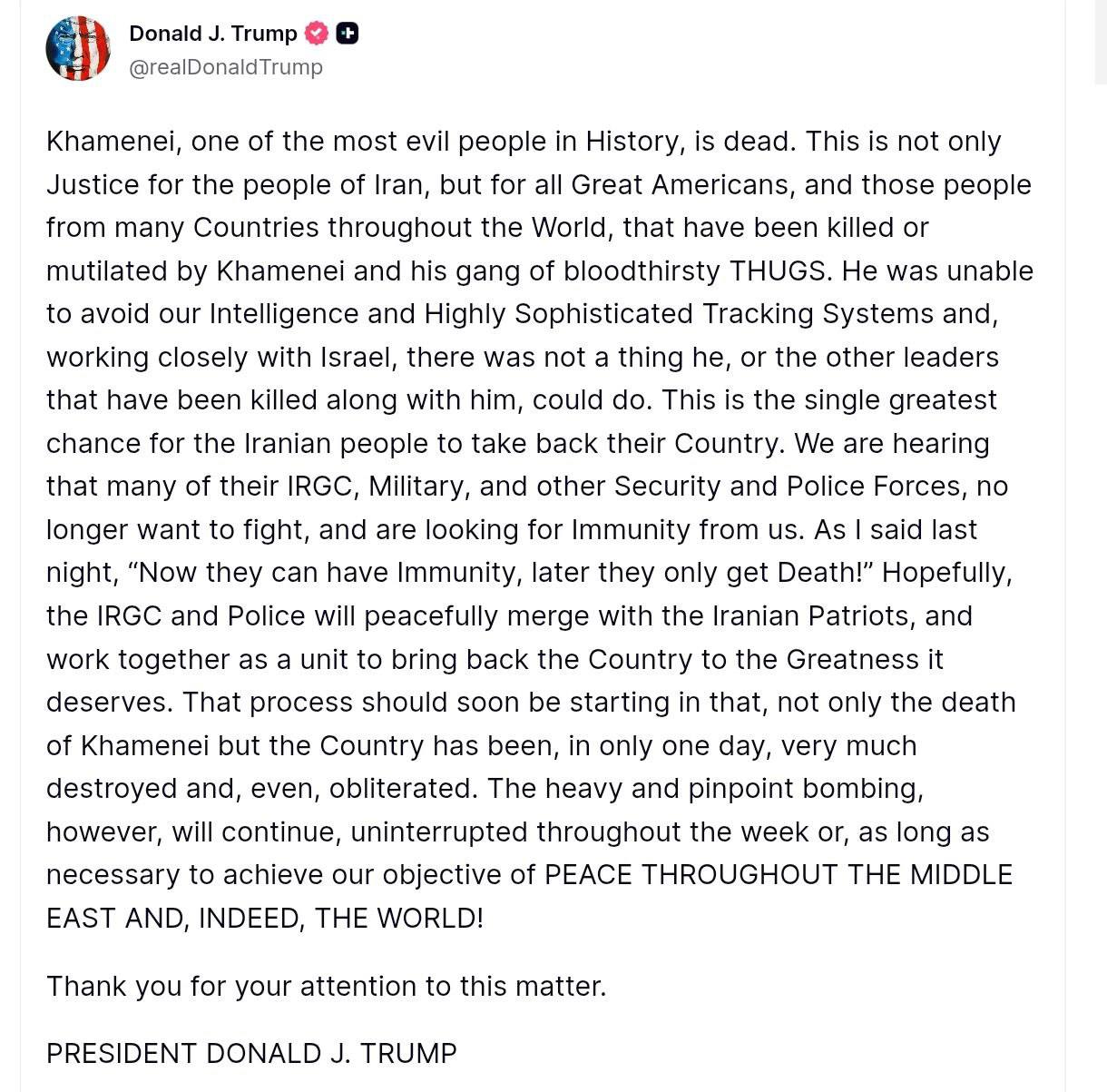 Это правосудие не только для народа Ирана, но и для всех великих американцев и тех людей из многих стран мира, которые были убиты или искалечены Хаменеи и его бандой кровожадных головорезов. Он не смог скрыться от нашей разведки и сверхсложных систем слежения, и, работая в тесном сотрудничестве с Израилем, ни он, ни другие лидеры, которые были убиты вместе с ним, ничего не смогли сделать.Это единственный шанс для иранского народа вернуть свою страну. Мы слышим, что многие из их КСИР, военных и других сил безопасности и полиции, больше не хотят воевать и хотят получить от нас иммунитет. Как я сказал вчера вечером, сейчас они могут получить иммунитет, позже их ждет только смерть! Надеемся, что КСИР и полиция мирно объединятся с иранскими патриотами и будут работать вместе как единое целое, чтобы вернуть стране то Величие, которого она заслуживает.