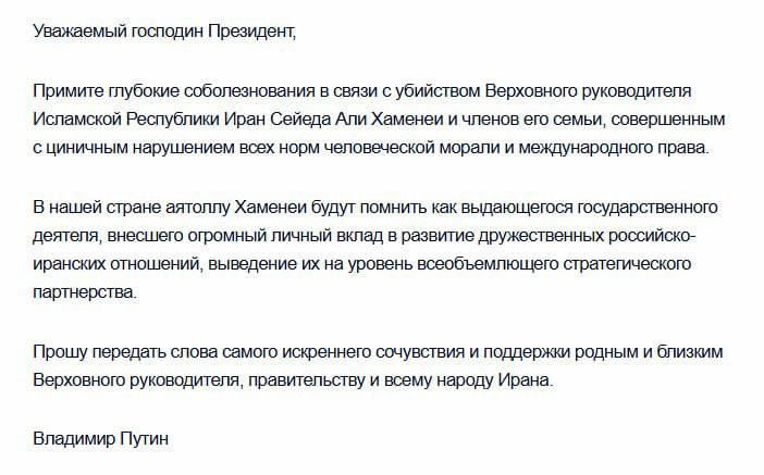 Путин выразил президенту Ирана Пезешкиану глубокие соболезнования в связи с убийством верховного лидера Хаменеи и членов его семьи