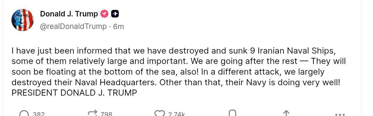 Трамп заявил о потоплении 9 иранских кораблей.