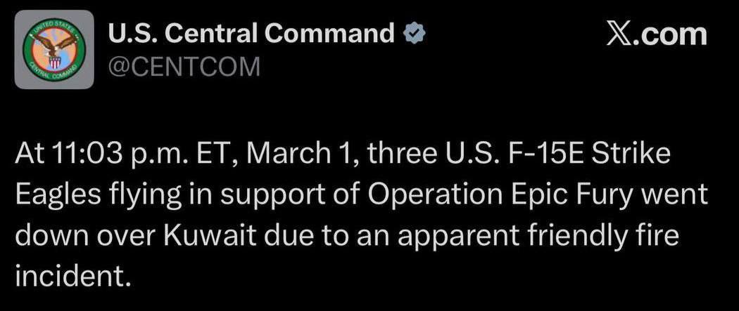 Центральное командование ВС США - United States Central Command (CENTCOM) - подтвердило: три американских F-15E Strike Eagle были уничтожены силами ПВО Кувейта по ошибке.