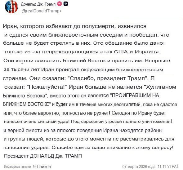 Час Х, о котором сегодня заявил Трамп, приближается. И особый цинизм тут в том, что на фоне уже идущей совместной операции США и Израиля против Ирана Трамп говорит о новых ударах как о чем-то почти рутинном. По факту же — это ответ на заявление временного руководящего совета Ирана, который постановил прекратить удары по государствам региона.