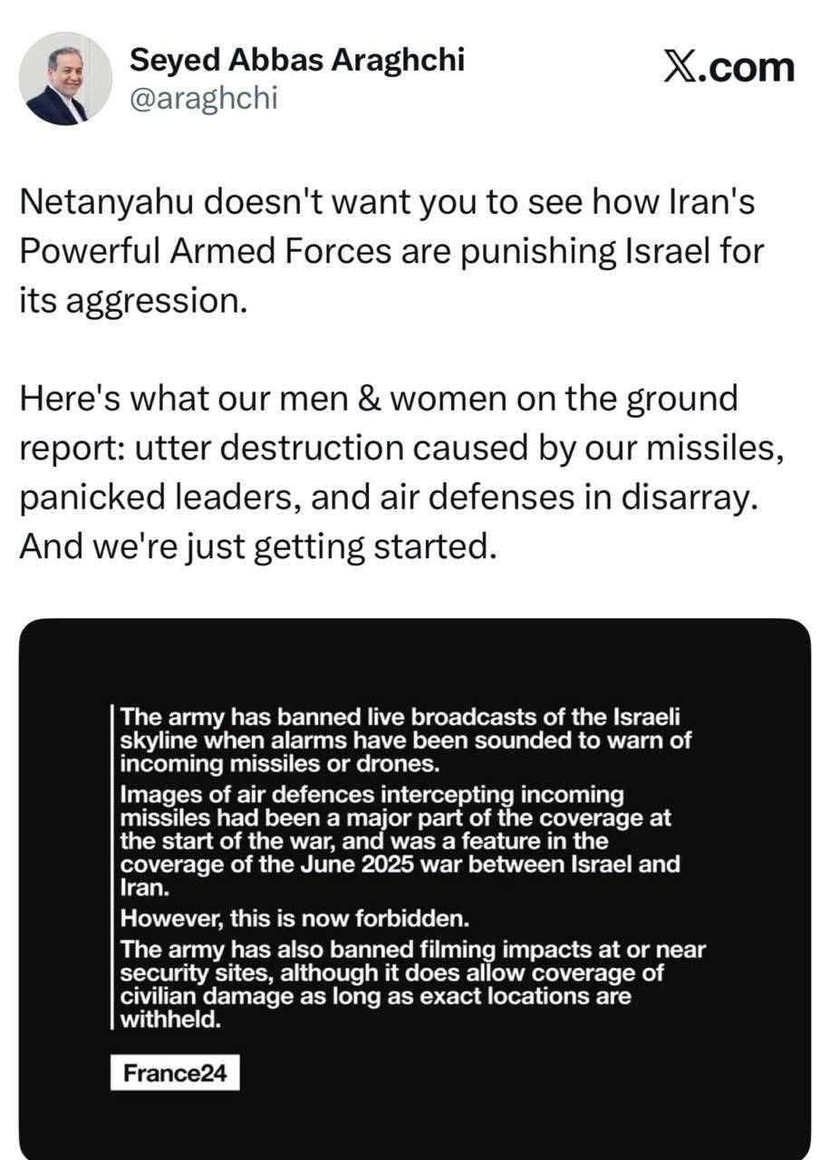 Министр иностранных дел Ирана Аббас Аракчи прокомментировал запрет на съёмку последствий ударов по израильским объектам.