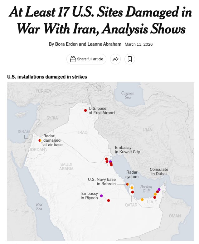 Спутниковая съемка и открытые источники позволяют сложить более полную картину первых дней конфликта. Как выяснила The New York Times на основе коммерческих снимков, видео из соцсетей и официальных данных, как минимум 17 американских объектов получили повреждения в результате иранских ударов. И это только то, что удалось подтвердить визуально.