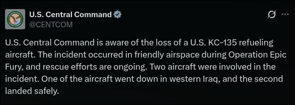 Центральное командование ВС США (CENTCOM) сообщило о потере самолета-заправщика KC-135 во время операции «Epic Fury».
