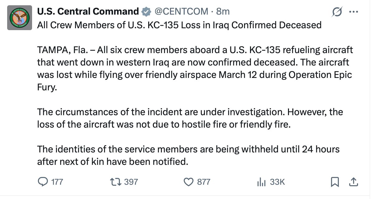 «Обстоятельства инцидента выясняются. Однако потеря самолета не была вызвана огнем противника или дружественным огнем».