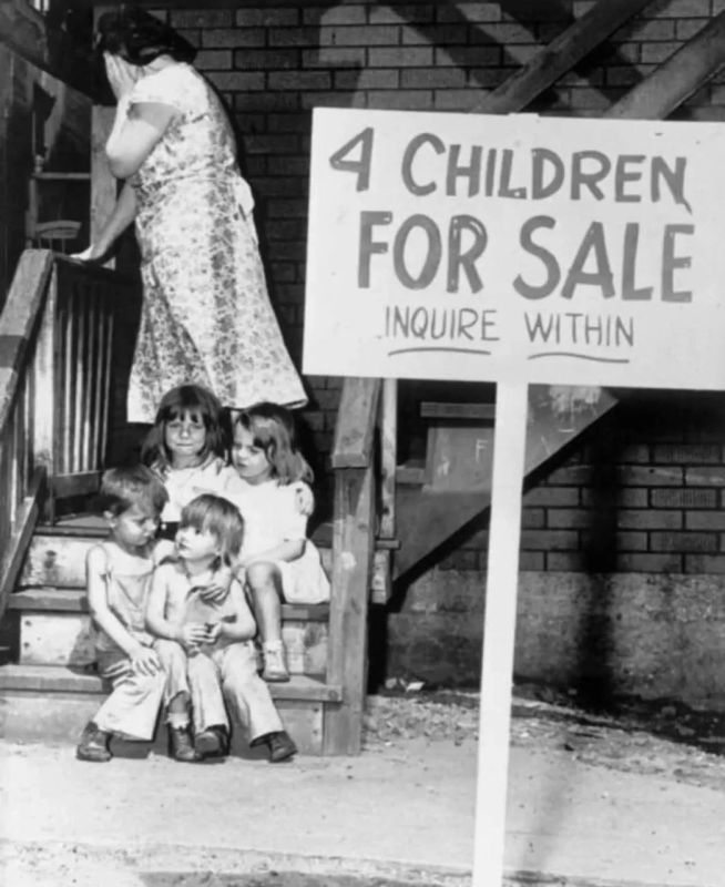 В послевоенные годы в Америке и вовсе продавали детей на фоне голода. Широко известна фотография «4 ребенка на продажу» 1948 года.
