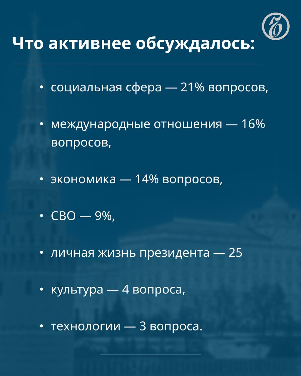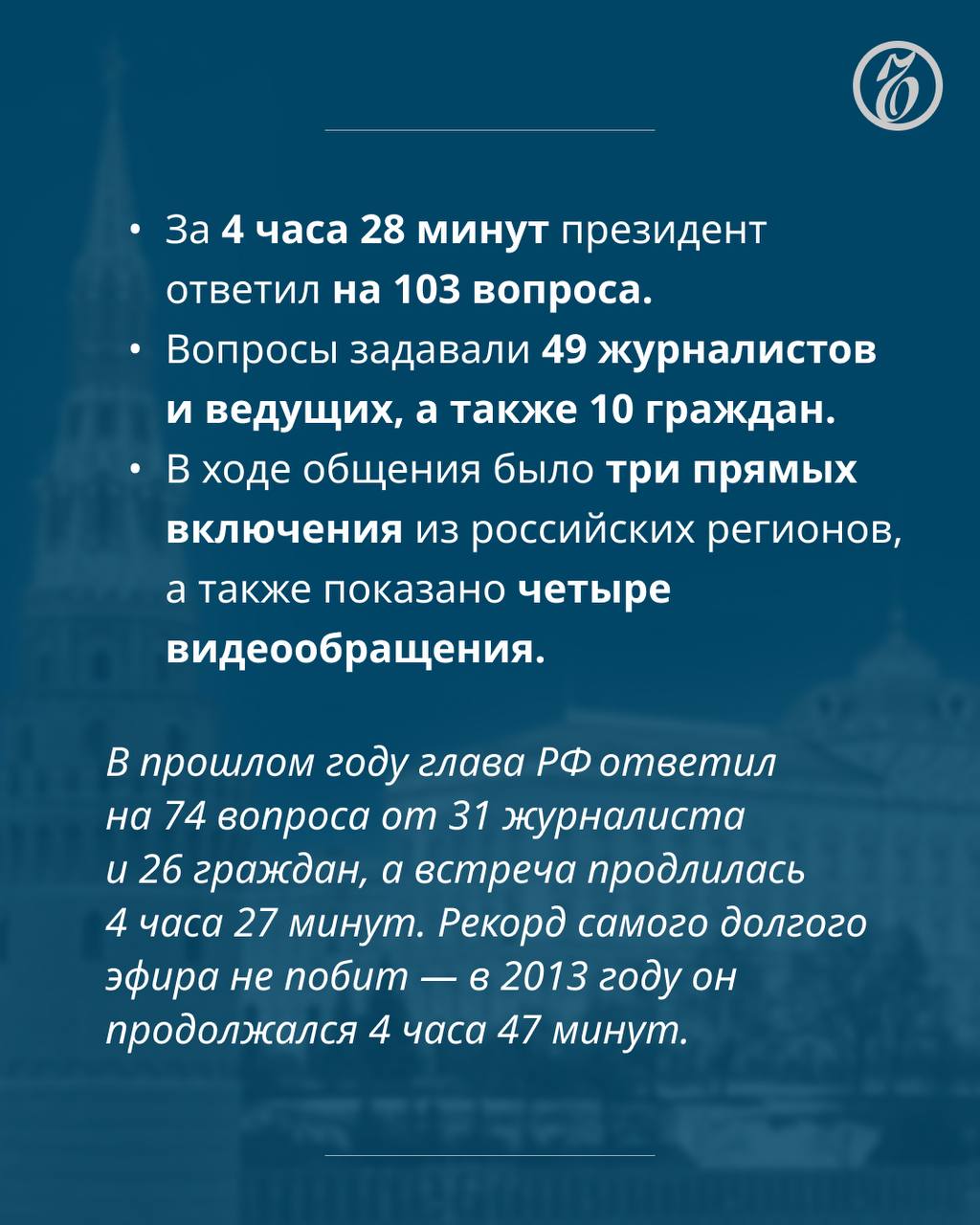 Сегодня в Гостином дворе Владимир Путин подвел итоги года. Мероприятие прошло в формате совмещенной прямой линии с пресс-конференцией. Президенту прислали более 3 млн вопросов. За 4,5 часа господин Путин ответил на 103 из них.