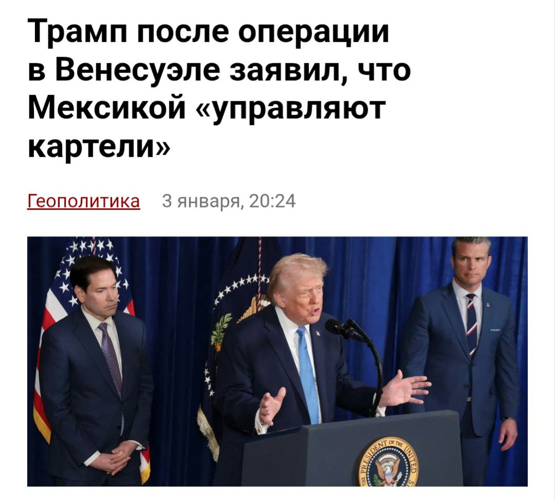 - "Президент Дональд Трамп: наши народы и наш регион заслуживают мира и диалога, а не войны": исполняющая обязанности президента Венесуэлы Родригес обратилась к Трампу с заявлением, что жители Венесуэлы и США достойны мира, а не войны.// ВЕСТИ