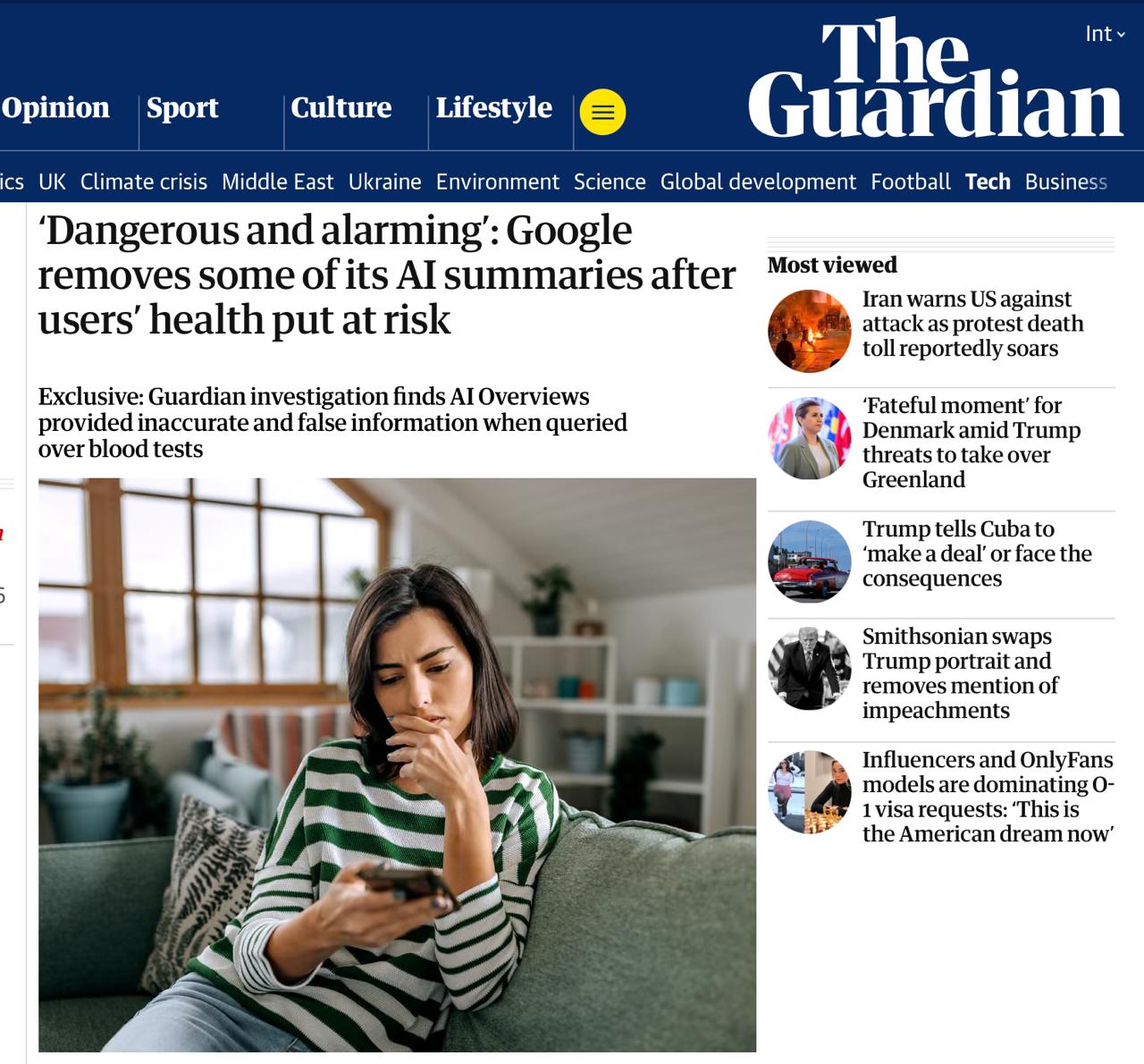 Как отмечает газета, ИИ Google также предоставил ложную информацию о важнейших печеночных пробах, из-за чего люди с серьезными заболеваниями печени могли ошибочно полагать, что они здоровы, и отказываться от необходимой медицинской помощи.
