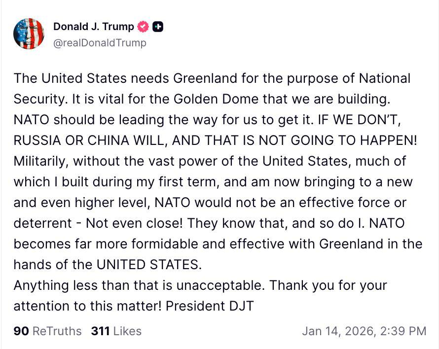 По словам президента США, остров важен для создания системы "золотой купол". И НАТО якобы должна проложить Америке путь к получению Гренландии.