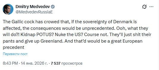 "Французский петух прокукарекал, что, если пострадает суверенитет Дании, последствия будут беспрецедентными. О, что они сделают?! Похитят президента Соединенных Штатов? Нанесут ядерный удар по США? Конечно нет. Они просто обделаются и сдадут Гренландию. И это станет отличным европейским прецедентом".