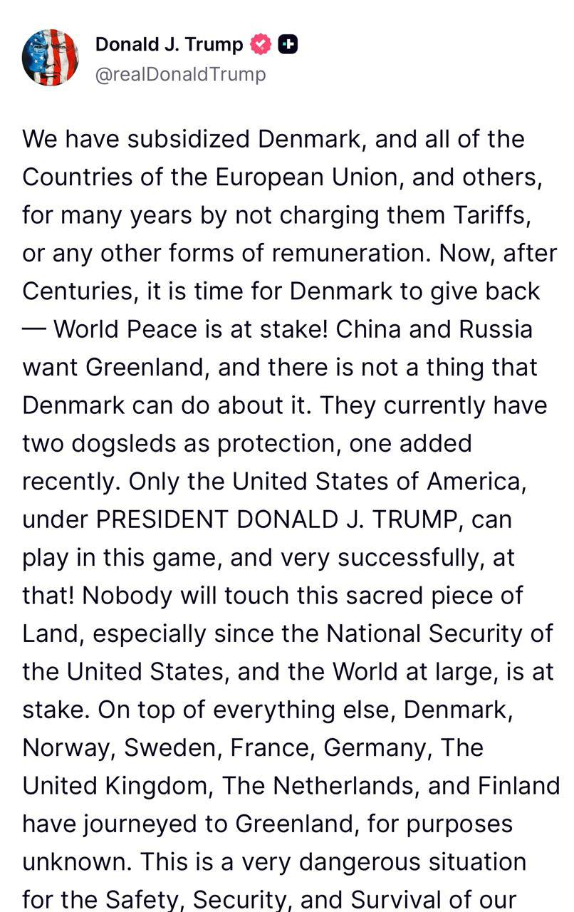 Трамп опубликовал ряд заявлений по поводу ситуации вокруг Гренландии и в Иране в социальной сети Truth Social