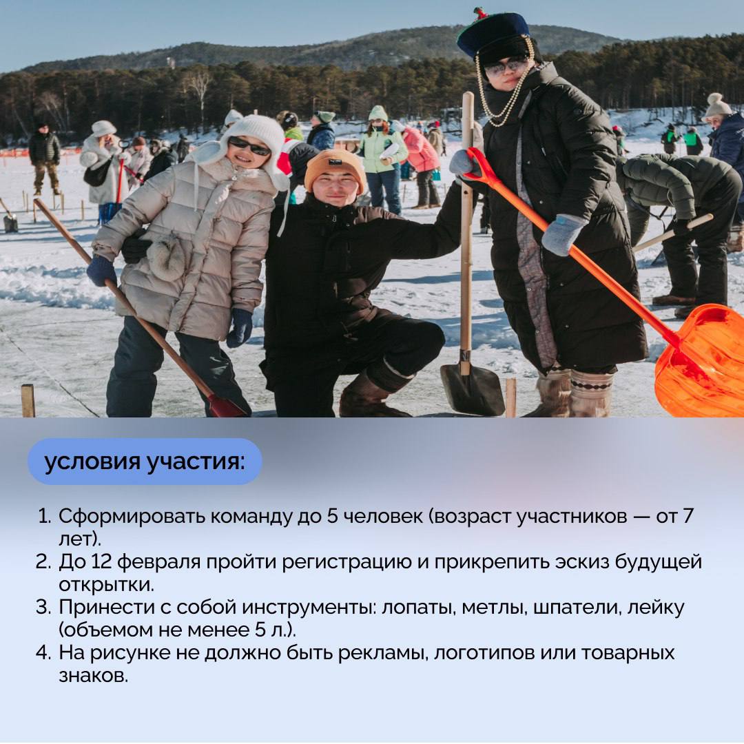 Соберите дружную команду до 5 человек (от 7 лет) и создайте настоящий шедевр на кристальном льду священного Байкала. Подайте заявку и загрузите эскиз своей будущей открытки уже сейчас.