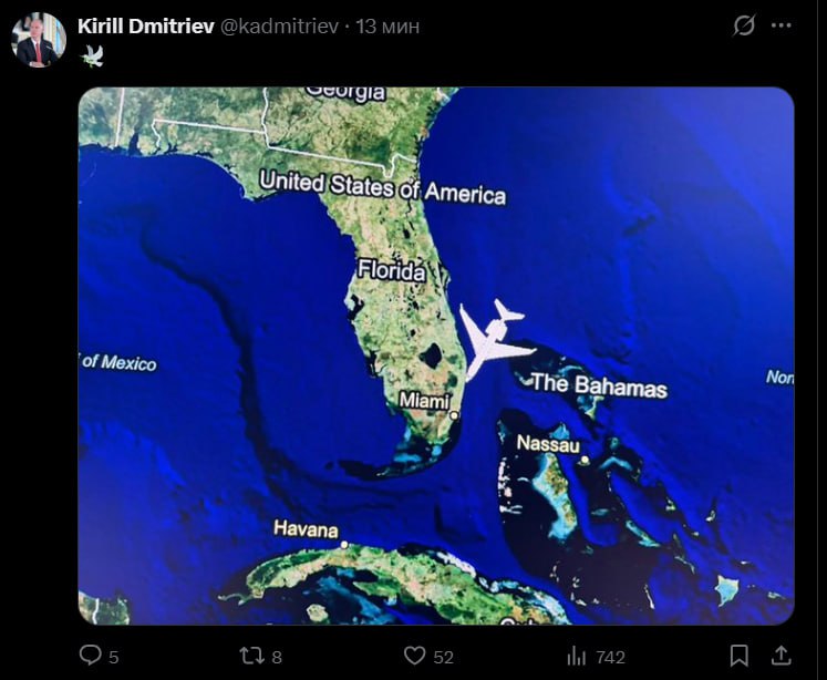 Об этом глава РФПИ сообщил в соцсети X, выложив фото карты с изображением самолета у побережья Флориды.