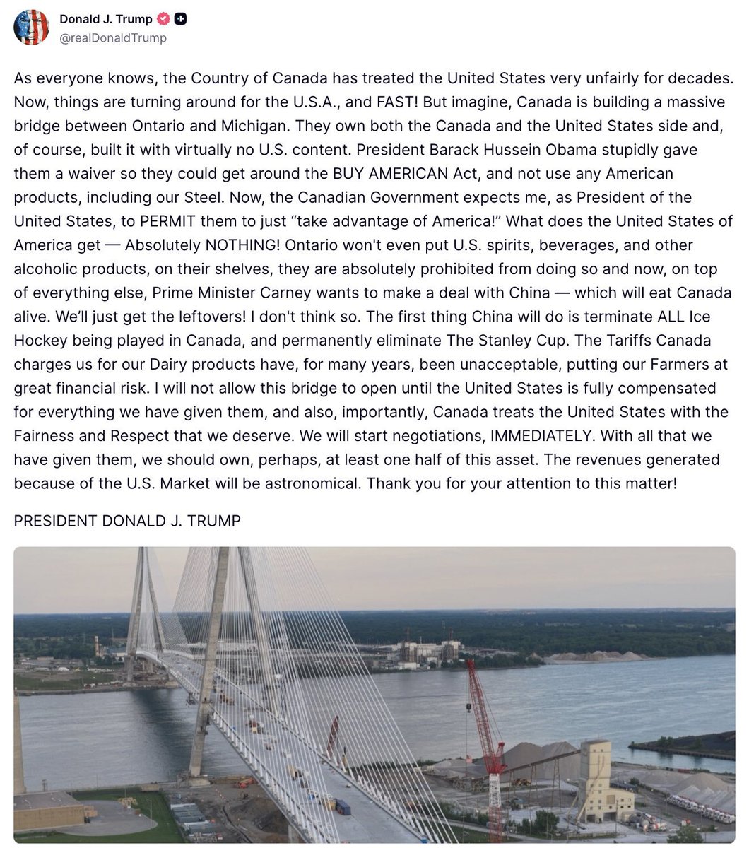 "Я не позволю открыть этот мост, пока США не получат полную компенсацию за все, что мы им предоставили, а также, что немаловажно, Канада не будет относиться США со справедливостью и уважением, которых мы заслуживаем".