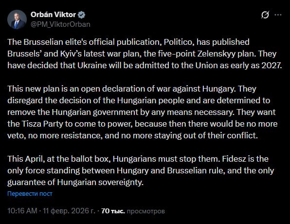 Этот новый план — открытое объявление войны Венгрии. Они игнорируют решение венгерского народа и полны решимости любыми средствами сместить венгерское правительство. Они хотят привести к власти партию "Тиса", потому что тогда не будет ни права вето, ни сопротивления, ни отказа от участия в их конфликте.
