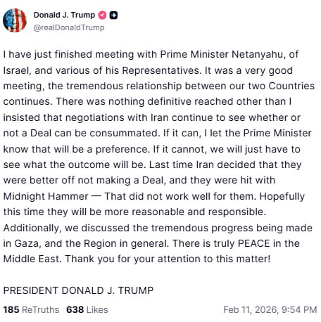 "Мы не достигли чего-то конкретного, кроме того, что я настоял на продолжении переговоров с Ираном, чтобы выяснить, возможно ли заключение сделки. Если это возможно, я дам понять премьер-министру, что это будет предпочтительнее".