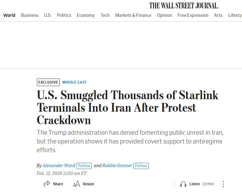 США закупили и тайно ввезли в Иран около 6000 терминалов Starlink после подавления беспорядков и протестов и отключения интернета; это первый случай, когда США напрямую отправили Starlink в Иран — WSJ