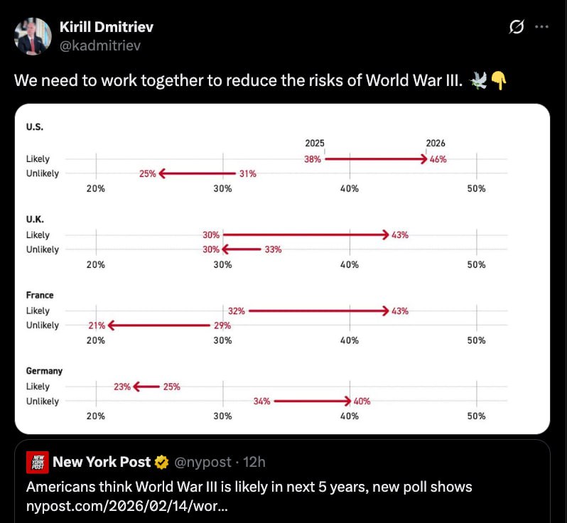 — написал он в X, комментируя публикацию газеты The New York Post. В ней приводятся результаты опроса среди жителей Великобритании, Германии, США и Франции, которые считают, что третья мировая война может начаться в ближайшие пять лет.