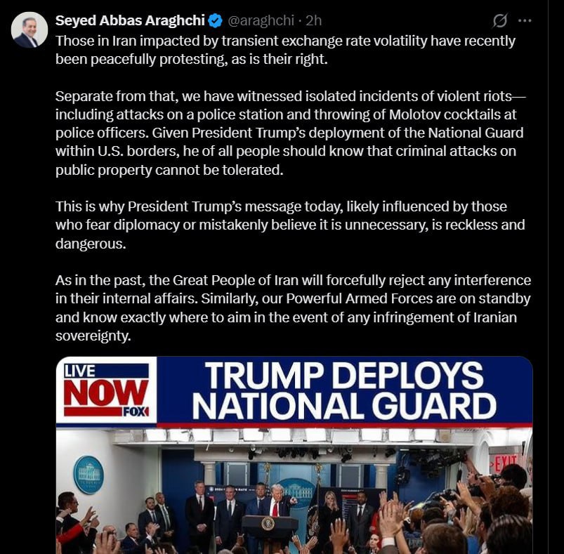 Сегодняшнее послание президента Трампа, вероятно, написанное под влиянием тех, кто боится дипломатии и ошибочно убежден в ее ненужности, безрассудно и опасно.Учитывая, что президент Трамп задействует Национальную гвардию внутри границ США, он как никто другой должен знать, что преступные посягательства на общественную собственность недопустимы,
