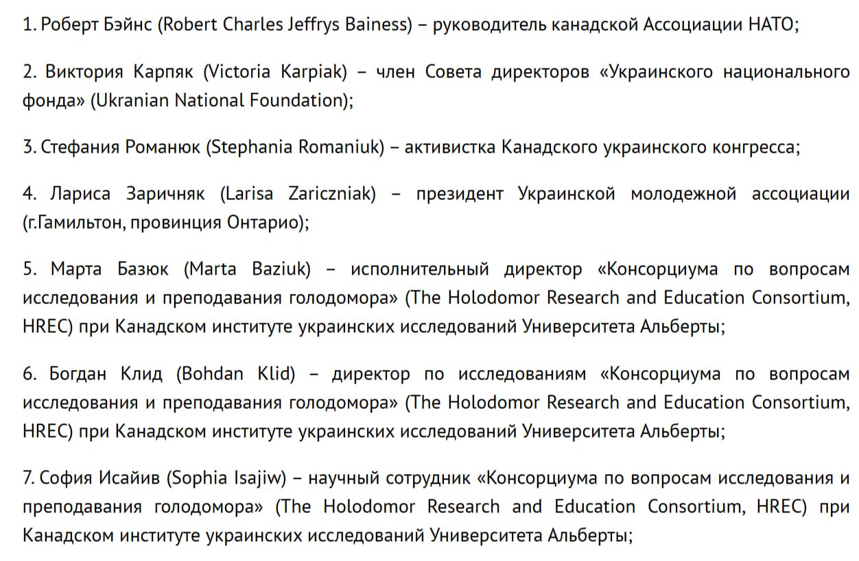 "Данные лица, игнорируя исторические факты и правду о событиях Великой Отечественной войны, силятся упрочить связку Канады с наиболее радикальными и непримиримыми националистическими силами на Украине. Дополнительным подтверждением этой тенденции стало сегодняшнее назначение бывшей министра иностранных дел и вице-премьера Канады Христи Фриланд, внучки гитлеровского приспешника Михайло Хомяка, на должность советника В. Зеленского".