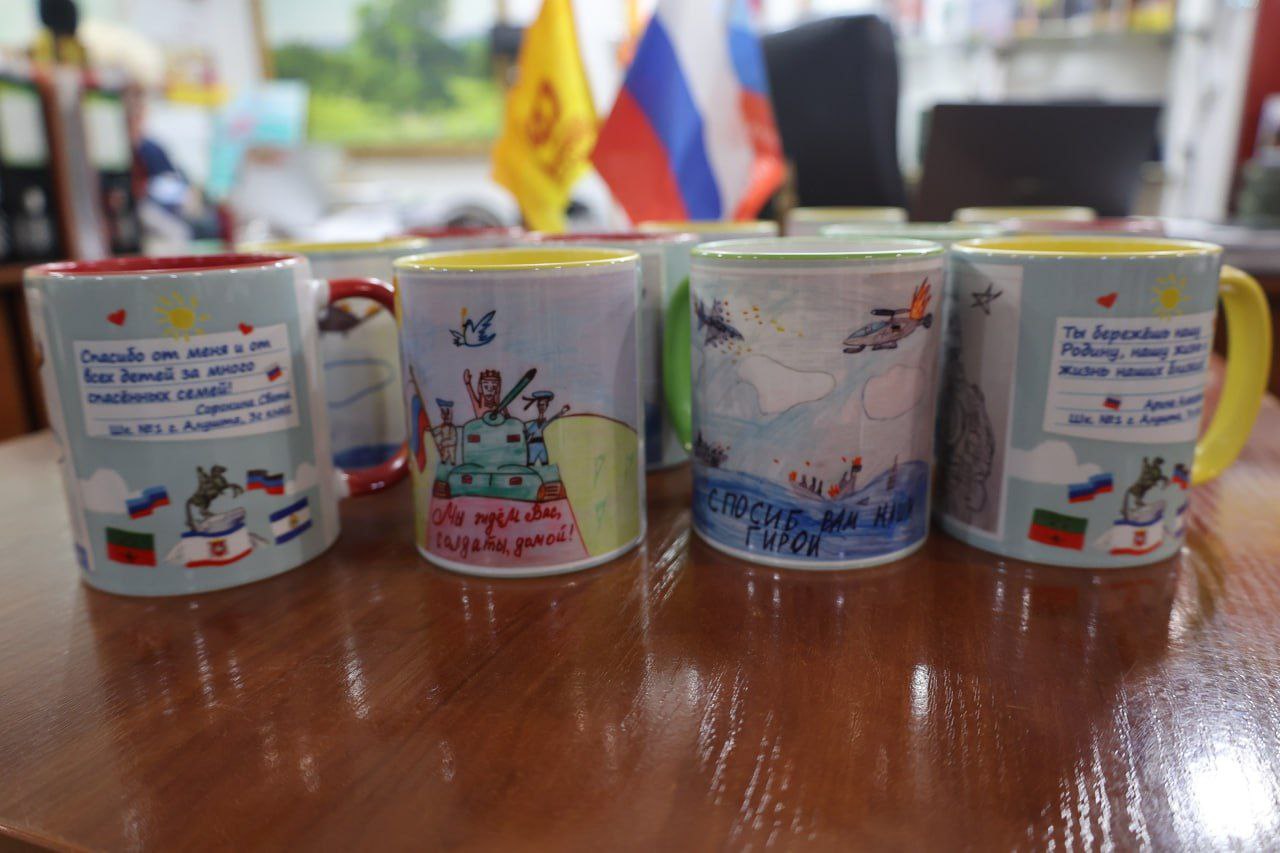 Особенно хочется отметить доставленные из Санкт-Петербурга от писателя Дениса Сорокина сувенирные чашки для военнослужащих. Ценность этого подарка заключается в том, что на кружках размещены детские рисунки с добрыми, позитивными надписями для наших защитников.