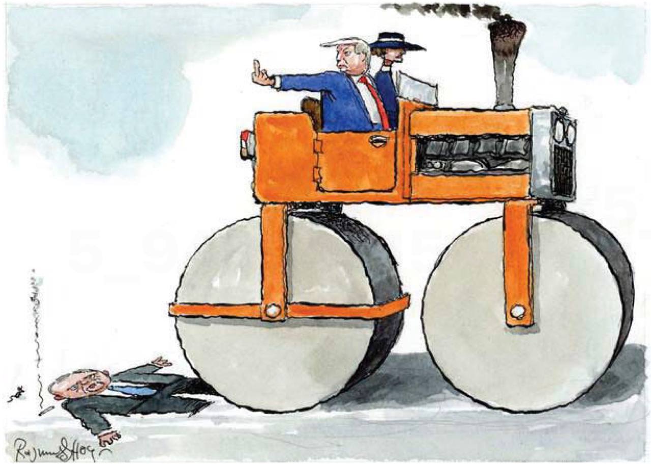 Однако газета Jyllands-Posten наглядно показала, что стало с главой датского МИД. Трамп проехался по нему катком, заодно повторив неприличный жест, недавно показанный на заводе Ford в адрес рабочего.