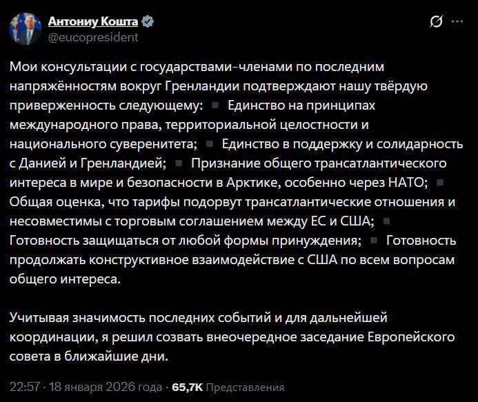 На повестке разборки вокруг Гренландии и свежие угрозы Трампа обрушить на Европу новые пошлины. О срочном сборе объявил лично председатель Евросовета Антониу Кошта. По слухам, встречаться будут уже в этот четверг.