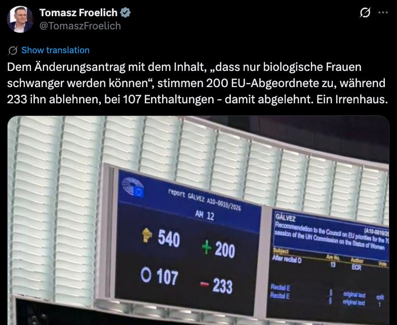 Первым о результатах голосования сообщил евродепутат от немецкой партии «Альтернатива для Германии» Томаш Фрелич. Он назвал произошедшее событием из хроники «дурдома». По данным голосования, лишь 200 его коллег согласились с тем, что мужчины не могут рожать, тогда как 233 выступили против этой поправки, а 107 человек предпочли воздержаться.