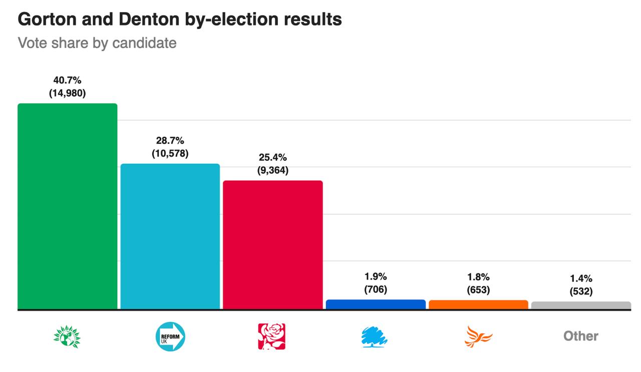 Последнее неудивительно, учитывая тот факт, что речь идёт об округе, где под треть населения составляют мигранты из Пакистана. Зелёные даже вели агитацию на урду. Второе место занял кандидат от “Партии Реформ” Найджела Фараджа, он как раз двигал антимигрантскую повестку. Лейбористы же упали на третье место. Хоть в 2024 году в этом округе они брали 51% голосов.