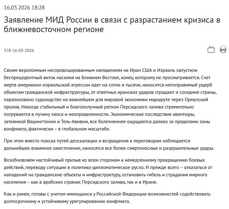 "Своим вероломным неспровоцированным нападением на Иран США и Израиль запустили беспрецедентный виток насилия на Ближнем Востоке, конец которому не просматривается. Счет жертв американо-израильской агрессии идет на сотни и тысячи, наносится непоправимый ущерб объектам гражданской инфраструктуры, от ответных иранских ударов страдают и соседние страны, парализовано судоходство на важнейшем для мировой экономики маршруте через Ормузский пролив. Некогда стабильный и благополучный регион Персидского залива стремительно погружается в пучину хаоса и неопределенности".