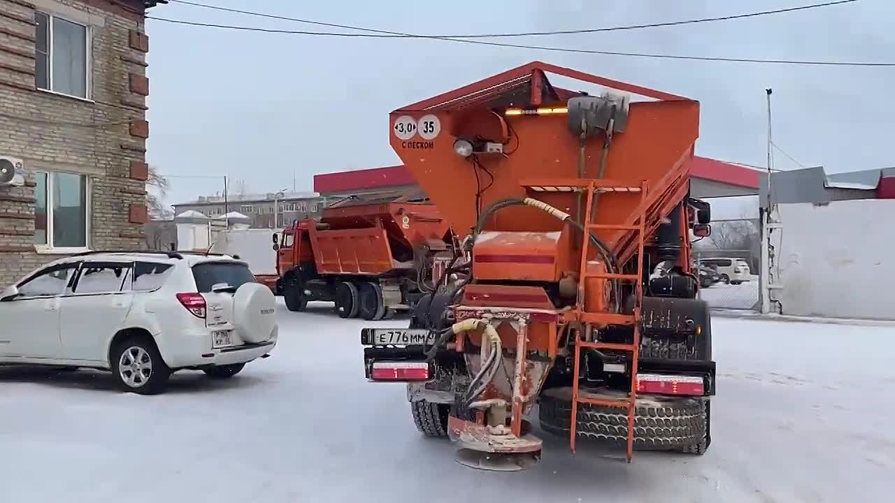 В Улан-Удэ продолжается небольшой снегопад. Чтобы оперативно устранять образующийся небольшой накат на перекрестках и остановках на линии работают 13 пескоразбрасывающих машин. Водители работают посменно.