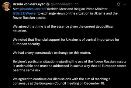 По итогам переговоров стороны признали критическую важность и срочность финансовой помощи Украине. Глава ЕК согласилась с Бартом Де Вевером, что все страны ЕС должны распределить риски от использования активов РФ.Участники договорились...