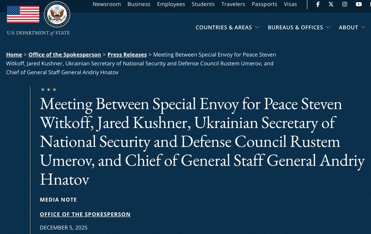 Уиткофф и Кушнер провели двухдневные встречи с секретарем СНБО Украины Умеровым и начальником Генштаба ВСУ Гнатовым, подтвердили в Госдепартаменте США. Переговоры продолжатся в субботу, 6 декабря.