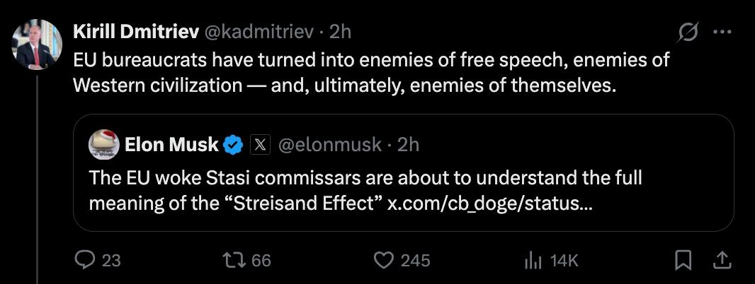 Глава РФПИ Кирилл Дмитриев в ответ на публикацию Маска заявил, что «бюрократы ЕС» превратились во «врагов свободы слова» и «западной цивилизации».