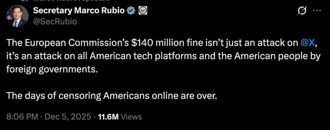 Госсекретарь Марк Рубио назвал штраф Еврокомиссии соцсети Х атакой на американский народ со стороны иностранных государств.