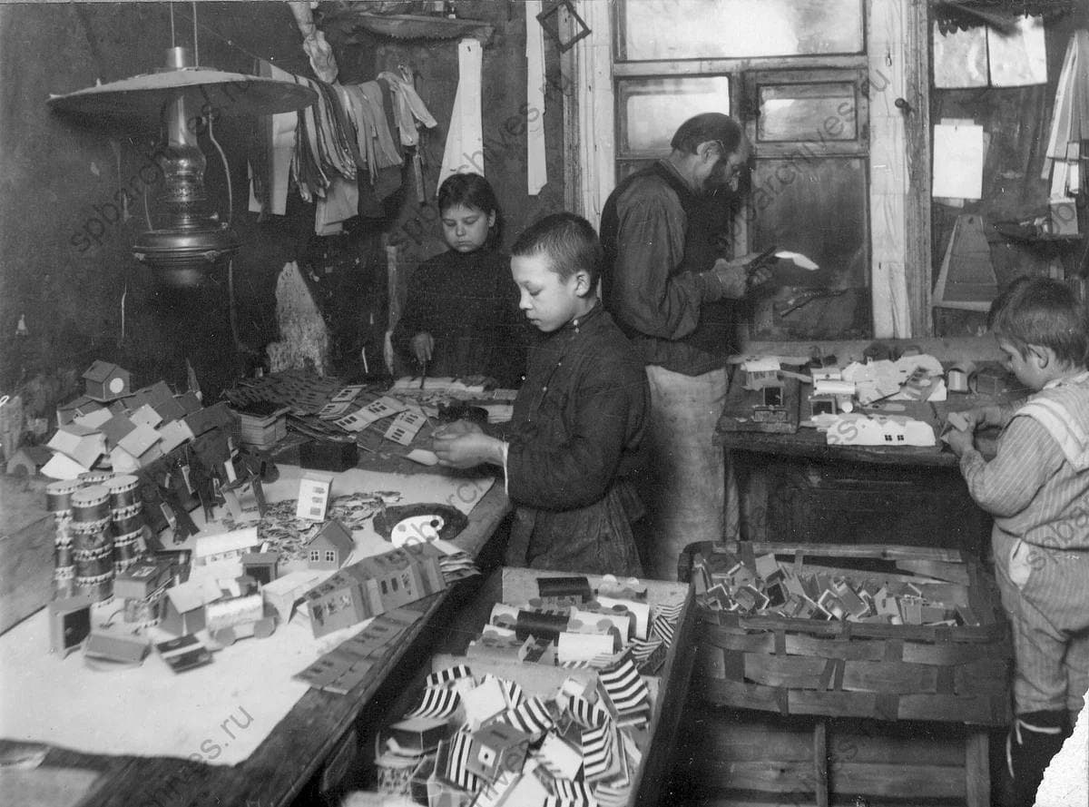 Канун Первой мировой войны. Дети изготавливают ёлочные игрушки в мастерской.