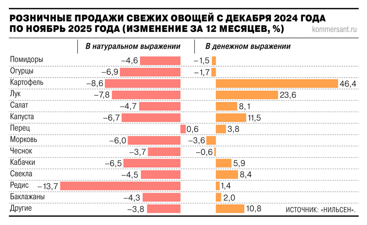 По данным аналитической компании «Нильсен», интерес к свежим овощам в рознице сейчас ограничен: практически все виды продукции в сегменте показали за последние 12 месяцев снижение натуральных продаж.