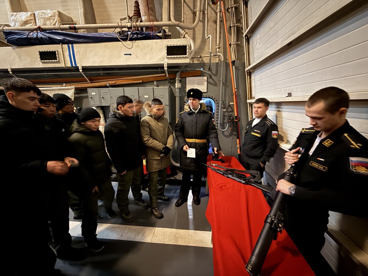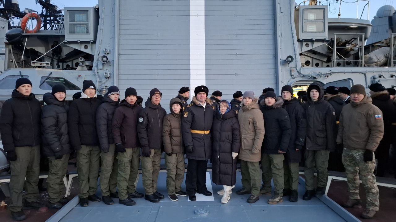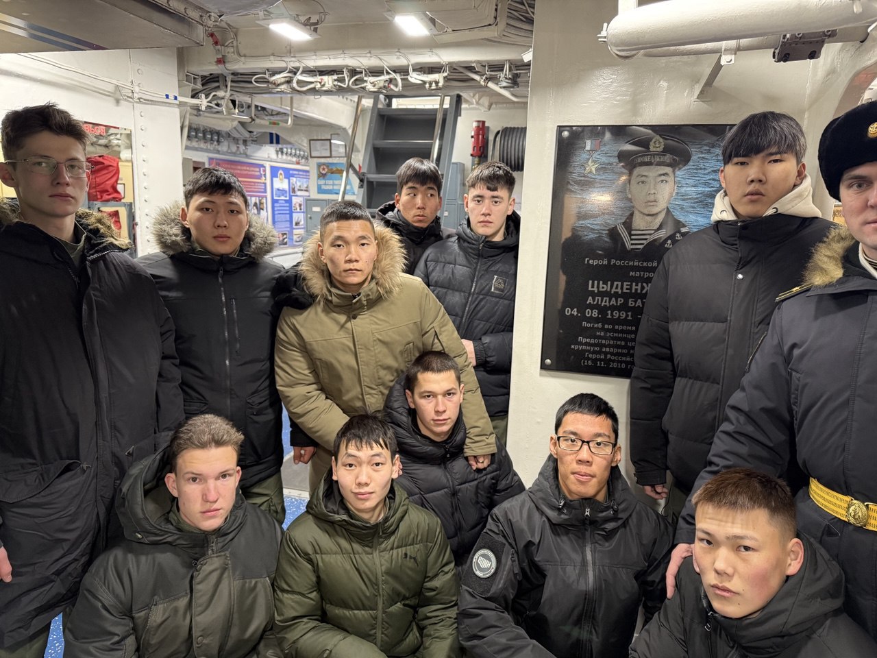 11 ребят из Бурятии — лучшие курсанты центра «Воин» — проведут на корвете целый день. Они учатся, спрашивают, в общем, пробуют атмосферу настоящей морской службы.