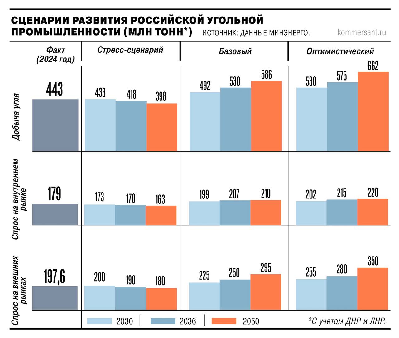 Минэнерго определило три возможных сценария развития российской угольной отрасли до 2050 года: стрессовый, базовый и оптимистический. Последний предполагает значительный рост мировых цен на твердое топливо и снятие санкционных ограничений.