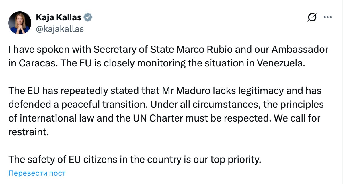 «ЕС неоднократно заявлял, что господин Мадуро не обладает легитимностью, и отстаивал мирный переходный период. При любых обстоятельствах должны соблюдаться принципы международного права и Устава ООН. Мы призываем к сдержанности», — написала она в X.