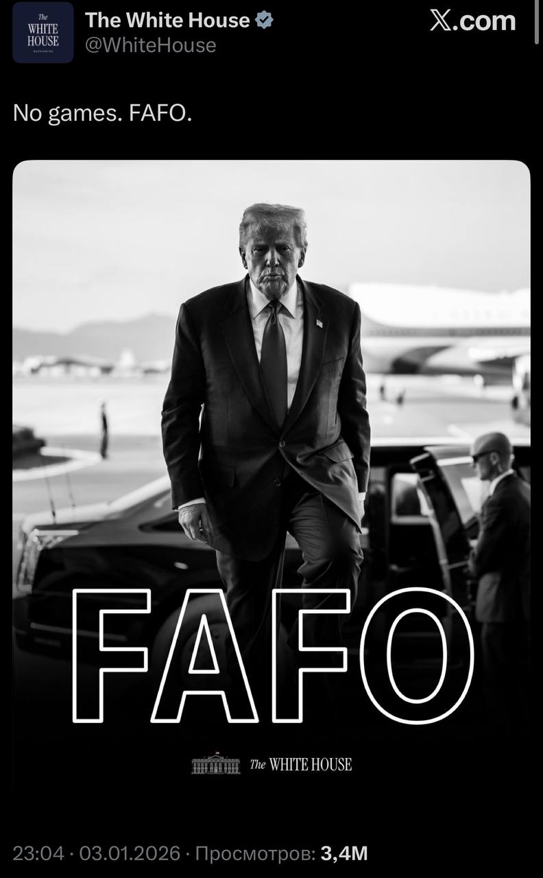 "Никаких игр. Будешь выделываться — огребешь": Белый дом после нападения США на Венесуэлу опубликовал фотографию Трампа со сленговым выражением FAFO, расшифровка которого включает ненормативную лексику.