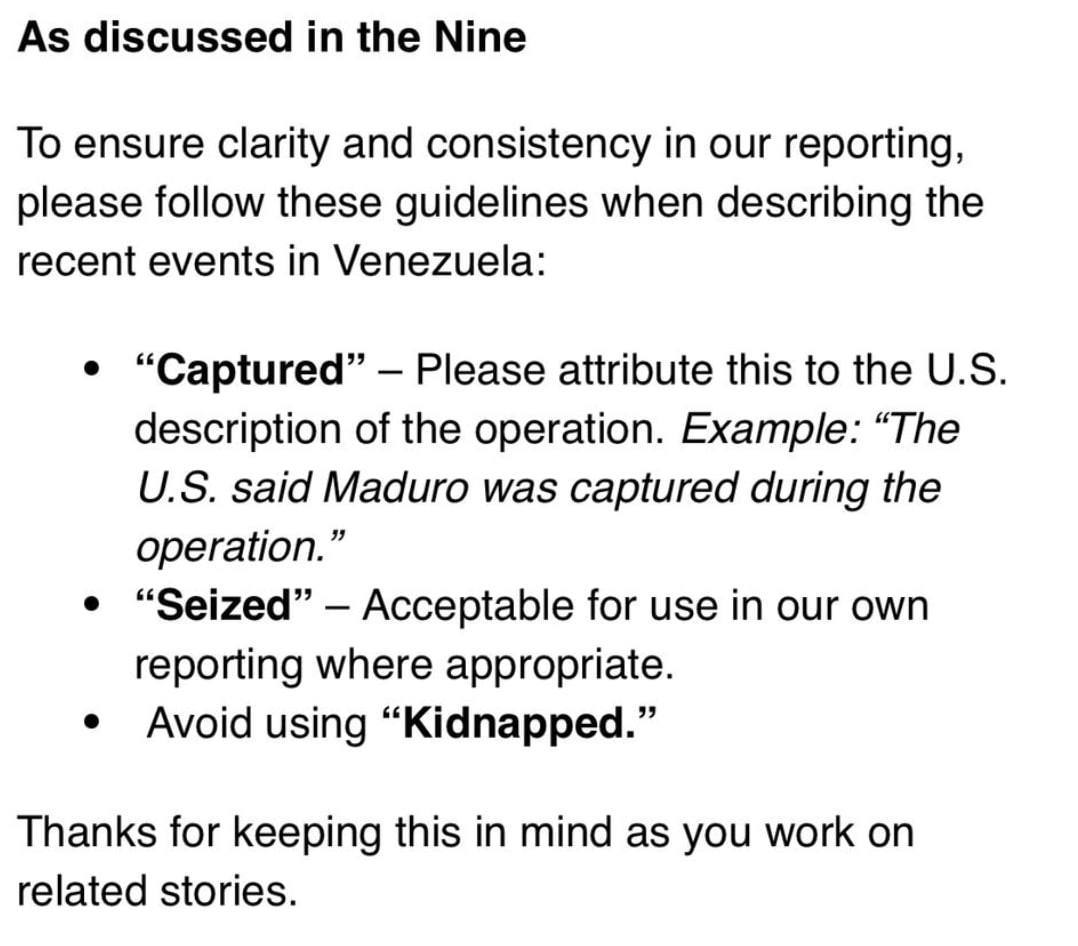 "Чтобы обеспечить ясность и единообразие в наших материалах, просим придерживаться следующих формулировок при описании недавних событий в Венесуэле:— “Captured” (“захвачен”) — использовать ТОЛЬКО со ссылкой на формулировку США. Пример: “США заявили, что Мадуро был захвачен в ходе операции”.