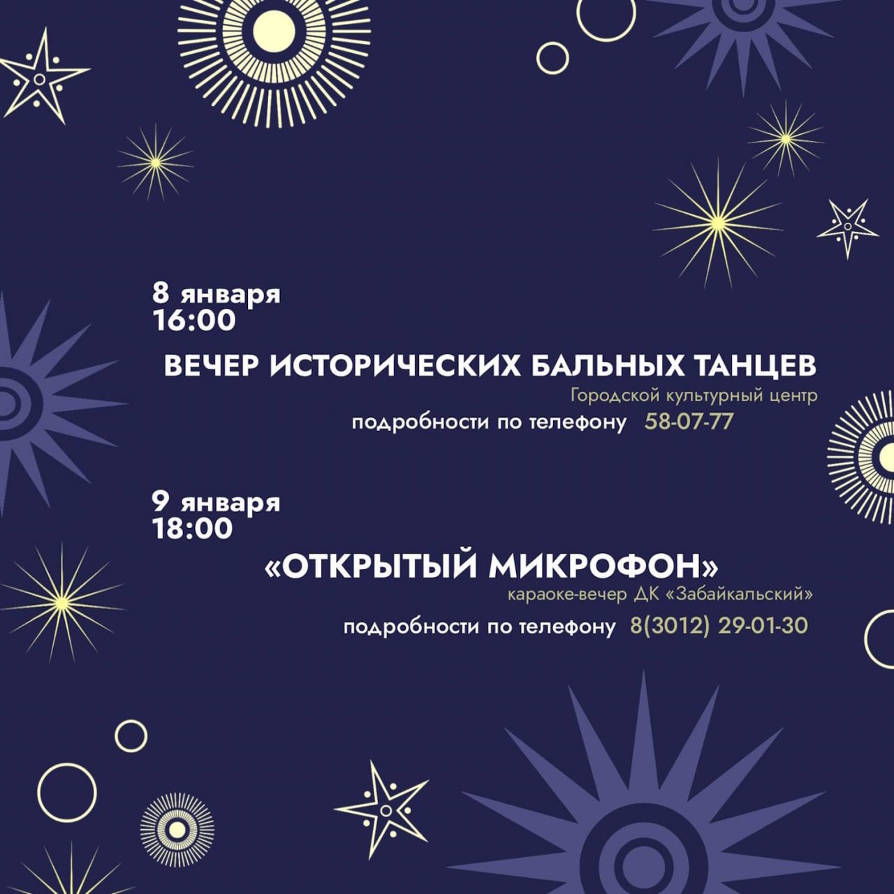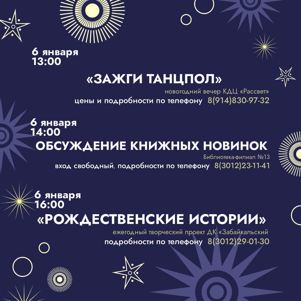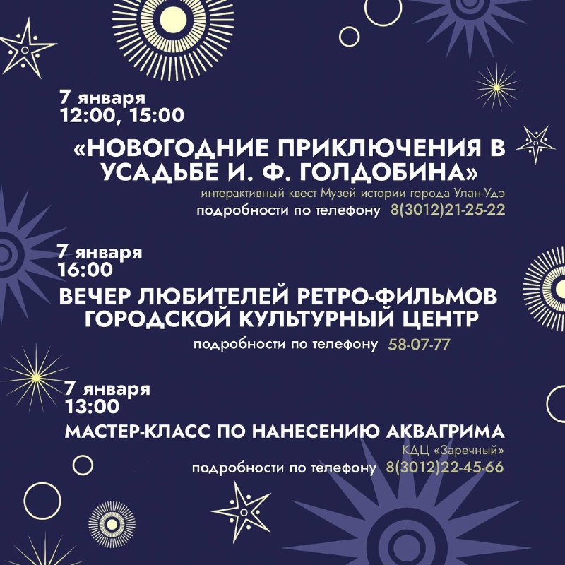 Дома культуры Улан-Удэ ждут гостей на вечерах песен, танцев, ретро-фильмов и рождественских историй. Музей истории приглашает на квест, посмотреть диапроектор и поиграть в настольные игры.