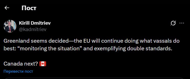 "Гренландия, похоже, уже решенный вопрос, ЕС будет продолжать делать то, что вассалы делают лучше всего: "следить за ситуацией" и демонстрировать двойные стандарты. Канада следующая?".