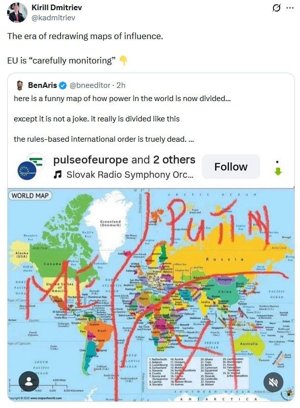 Глава РФПИ Кирилл Дмитриев, обративший внимание на этот мем, назвал текущий период «эпохой перерисовки карт влияния», а ЕС, по его словам, «внимательно следят» — просто ничего не делают.